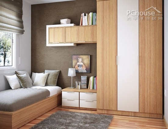 编辑点评:空间中,多处橱柜以及床架都采用木质材料。同时,地板也使用了复合木质地板,使整个空间非常清新自然。纯净的白色与木质在这个空间中互相配合,增添空间的温馨感。