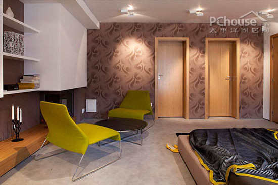 编辑点评:这一层有一个主卧室和第二个客房,一个大胆的展示了黄色和绿色的家具,色系的撞击同时也带来了强烈的视觉冲击的效果,突显青春活力