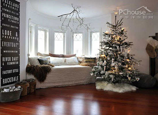 推荐理由:家居空间没有深色系的沉稳,但有浅淡的素雅,再搭配蕾丝圣诞长青环、白色带铃的圣诞树,小小的装饰令家别有一番风味。