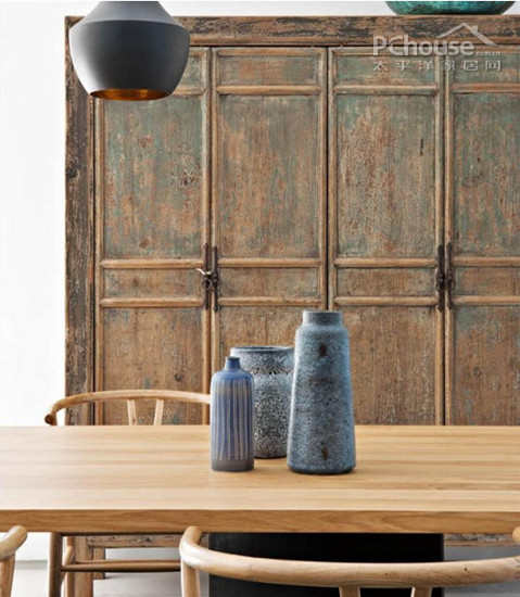 编辑点评:平滑具有光泽的木质餐桌背后,这款暗色的桃木橱柜显得仿佛有些年头。特意的做旧设计,让时光有了些沉淀。