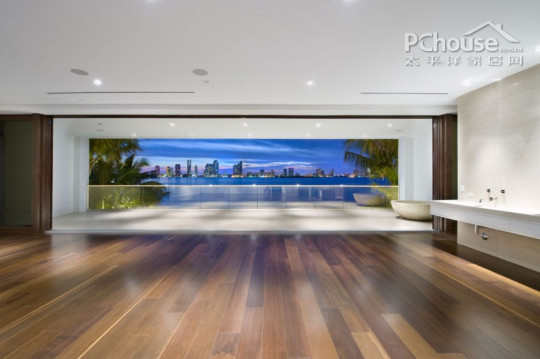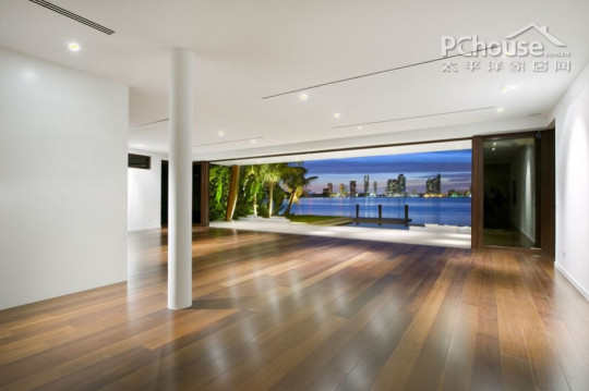 编辑点评:和玻璃阳台外的景色相呼应,室内也同样采用了宽广大方的设计理念。透明玻璃阳台给人无限想象的空间。自然颜色的木制地板和纯白色的墙壁搭配,清新自然。