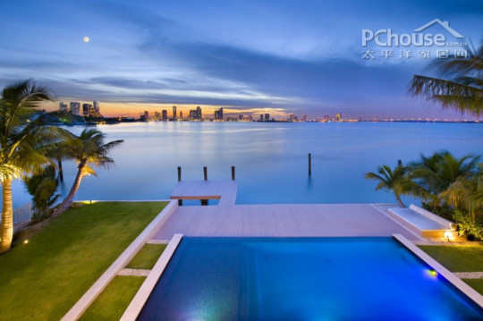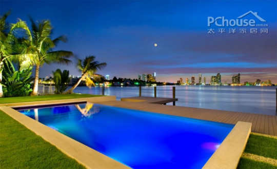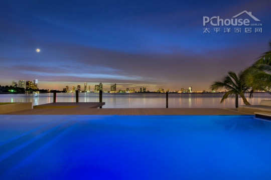 编辑点评:在海边生活,蓝色一定是主题色彩。水池的蓝色灯光设置让天、海以及门前的小水池看起来相互交融。深邃的蓝色能营造出最梦幻的海上夜景!