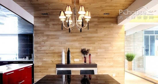 编辑点评:与整体空间的现代感不同,空间中只有这一堵墙是木质墙体,尤为抢眼,也颇显清新自然。搭配前方的华丽吊灯,整个空间又是传统与现代让融合的经典之作。