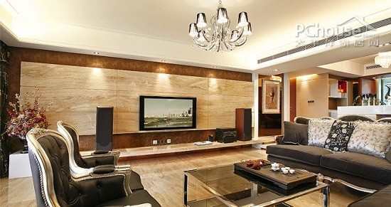 推荐理由:精致木材电视背景墙,搭配大气家具以及暖色灯光,衬托空间高雅情调。