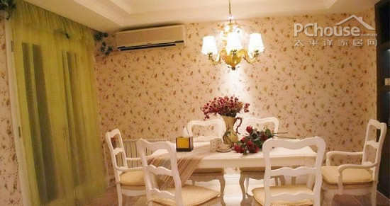 编辑点评:小清新风格的餐厅背景墙,令整个空间清新典雅。而一盏华丽的吊灯,又令整个充满了潮流感与尊贵感,再配上现代的餐桌椅,整个空间是现代与自然的完美结合。