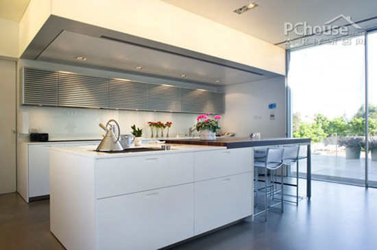 编辑点评:烹饪区与洗切菜区分开,使厨房区域更容易保洁。大型落地窗让厨房和室外很好的融合在一起。