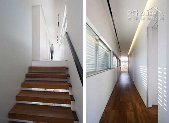 编辑点评:镂空的楼梯设计让光线自由穿透,照亮楼梯底下的空间,节约了材料的使用。黑色扶手紧贴墙壁,不占用狭窄的楼梯空间
