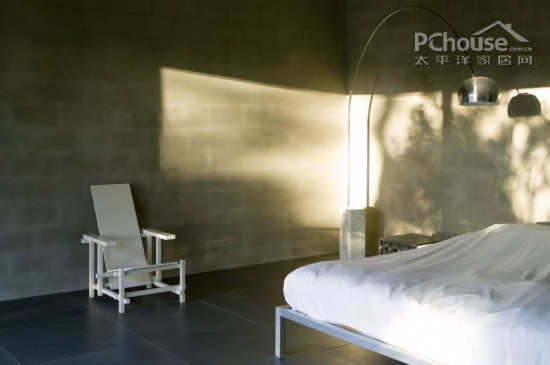 编辑点评:卧室的设计同样简单,墙壁与地板的色彩都十分简单不张扬。洁白的床面色彩和造型奇特的白色木椅十分惹眼,给呆滞的空间色调带来一丝灵动气息。