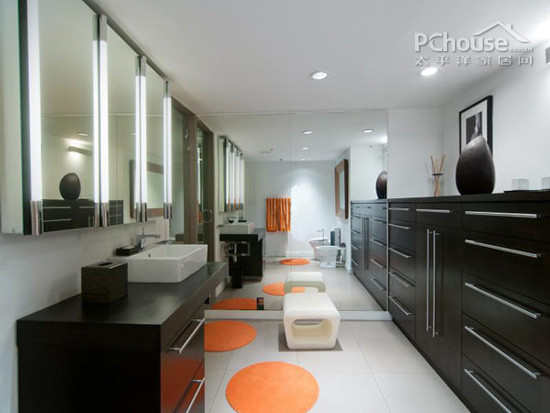 编辑点评:采用了超大面积的镜面设计,将卫浴空间从视觉上再进一步延伸扩大,同时黑色的家具选择,也令空间富有质感,而橘黄色的地毯搭配黑色的家具,在沉稳中又显得一丝的跳跃,很有格调。