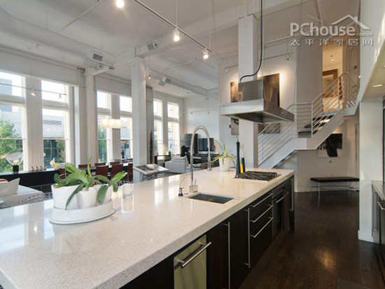 编辑点评:白色的长形操作台既与厨房整体风格相协调,又在这里接壤其他空间做过渡的作用。