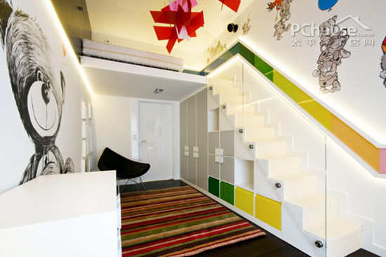 编辑点评:这个案例的楼层较高,可以再儿童房设计中考虑阁楼。这个设计适有着超强的收纳空间,楼梯下面全变成收纳抽屉。楼梯和阁楼设有钢化玻璃,起到保护的作用。