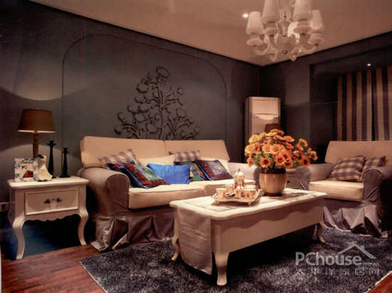 室内空间的色彩以白色和蓝色为主调,白色的家具、装饰品和蓝色的背景墙面交融在一起,在灯光的映照下形成一个典型的地中海空间。空间中不修边幅的线条展现了柔美与艺术化的一面,沙发背景墙面上一株成长中的向日葵让空间有了延伸的同时也让空间有了更深度的内涵。