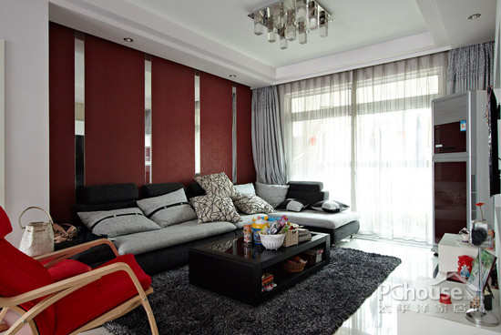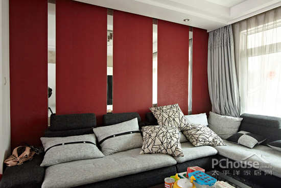 红色的沙发背景墙设计,设计师在背景墙设计中巧妙地应用了条形镜面的装饰。