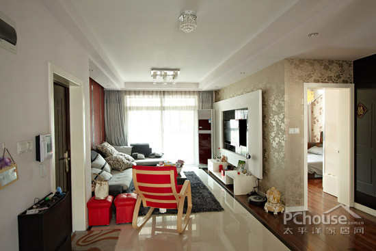 红色的座椅摆放在门旁,在空间上也避免了一开门就直视客厅的尴尬。