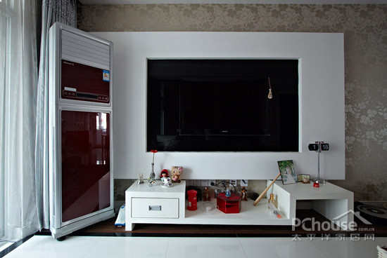 电视背景墙采用突出的墙面效果,使电视机设计像是嵌入墙体般的自然。巧妙的柜子设计,也为整个电视背景添色不少。