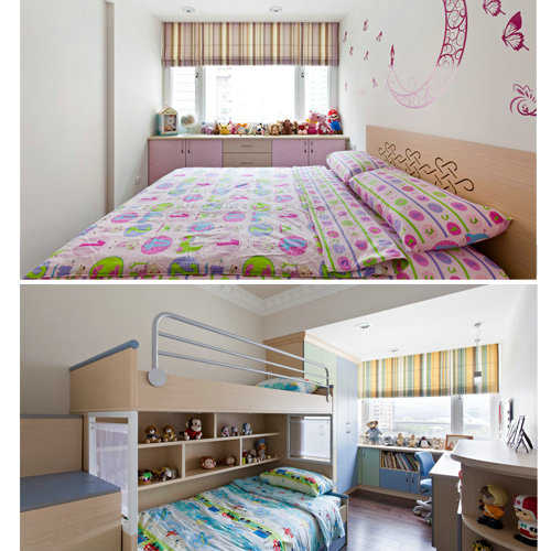 色彩缤纷的小孩房,詹芳玫细腻的以木作包覆冷媒管杂乱,局部带出成熟的摩洛哥造型。