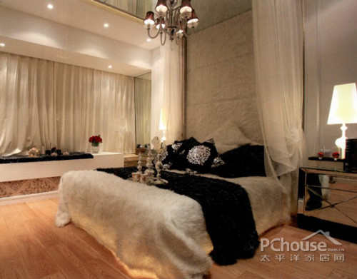 纱帘的设计弥漫着暧昧的气息,设计师通过床罩的选用,柜子的镜面装饰和吊灯的设计应用,打造了一个典雅的家居卧室。