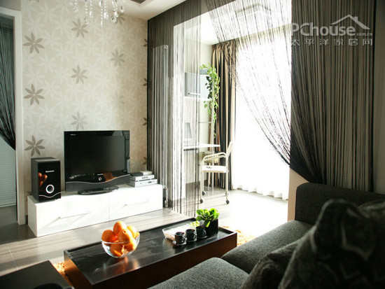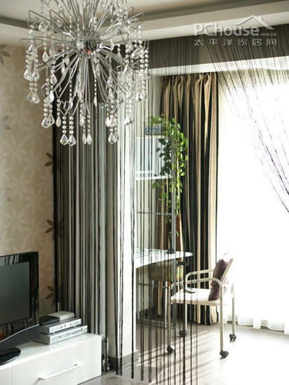 阳台用纱帘和客厅分割开来,兼有休闲区和工作间的双重用途,垂顺细致的材质更增添几分时尚感。