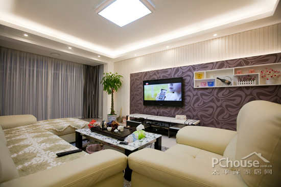 客厅作为公共活动空间,设计风格以简约、雅致为主。方形吊顶内部设有白色灯带,看上去简洁大方。