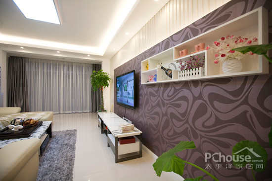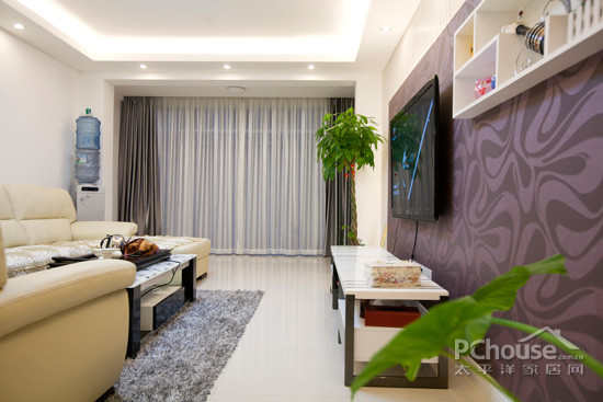 从侧面来看下背景墙的效果吧。。电视柜也选择了简约款式,白色的台面和背景墙白色的浑水漆相呼应。