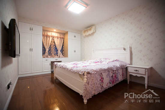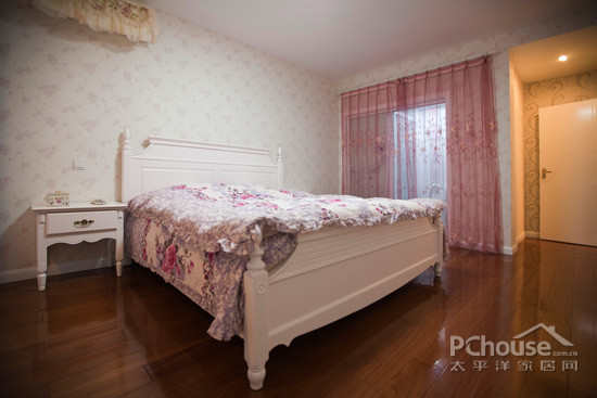 大床的色彩与墙纸的印花相呼应,呈现出田园温馨的效果。
