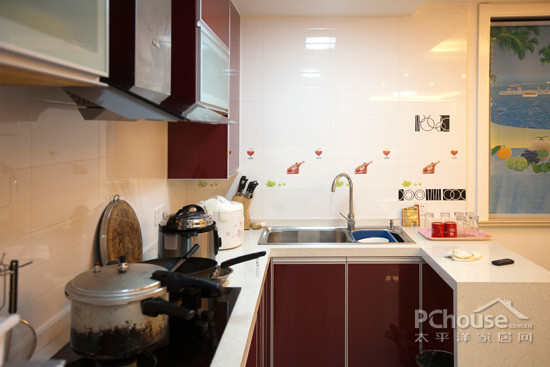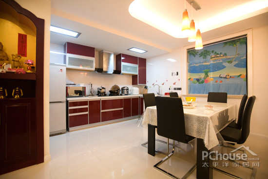 橱柜的面板采用烤漆面板,显的比较时尚,餐桌上的吊顶与吊灯正是给整个空间添上丰富的色彩。