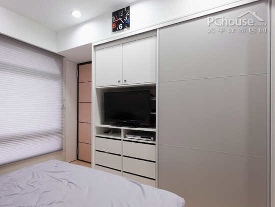 设计师在飘窗处加了一部分墙体。主要是为了方便做一个收纳柜。摆床时,床头靠背有地方放。