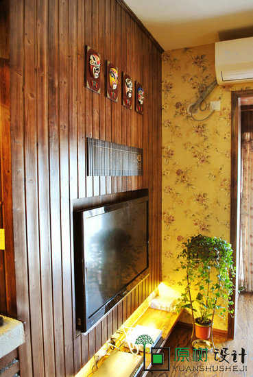 电视墙继续运用木杉的结构加上竹简和面谱的设计装饰,在复古风上增添中国风色彩。配上淡雅的花墙纸和绿色植物,让人感觉温馨。