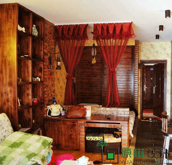 花卉的手绘墙纸和床罩彰显乡村田园风,卧室和客厅之间用一层红色的帘布作为分区,不仅增加了室内的区域性同时亦可以作为卧室的窗帘。