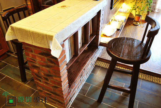 吧台局部,最下面放酒,上面放的是书,可以随时在吧台上看书,吃东西的时候很有情调。