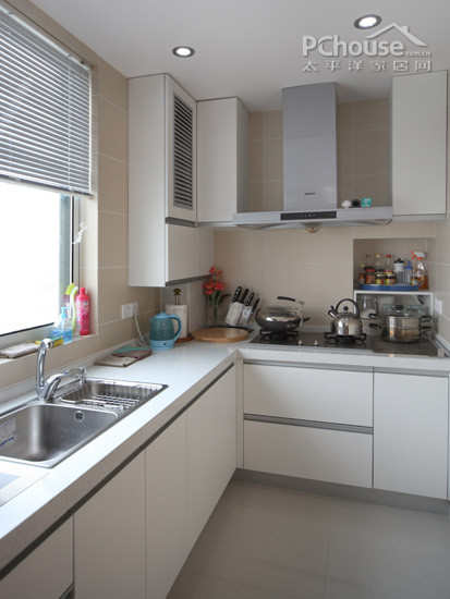 网友之前担心的开放厨房的问题,两边分别摆放冰箱、酒柜,一方面可以扩大厨房的形状,又起到遮掩的作用。
