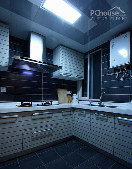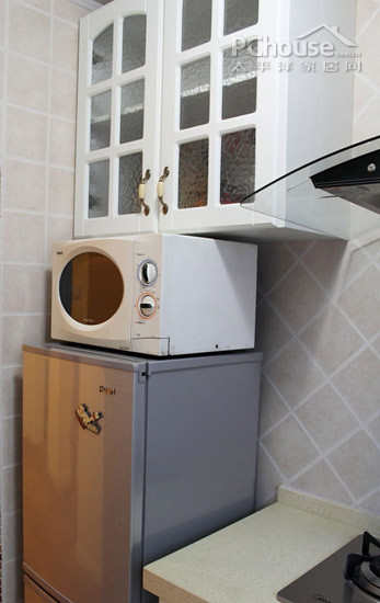 厨房设计的是玻璃推拉门,有利于采光和通风。L型的厨房收纳了基本的电器,冰箱、微波炉,当然还可以做顶部收纳柜。