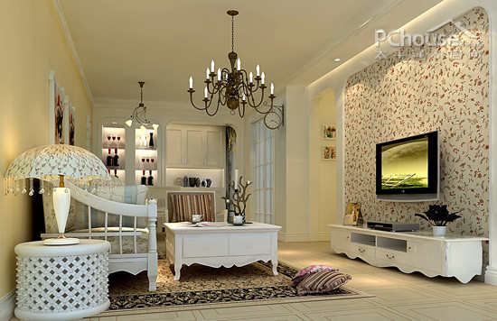 网友喜欢的是现代简约。同时又带点小田园的feel。碎花壁纸的电视背景。L型的沙发摆设,很适合小空间的客厅。