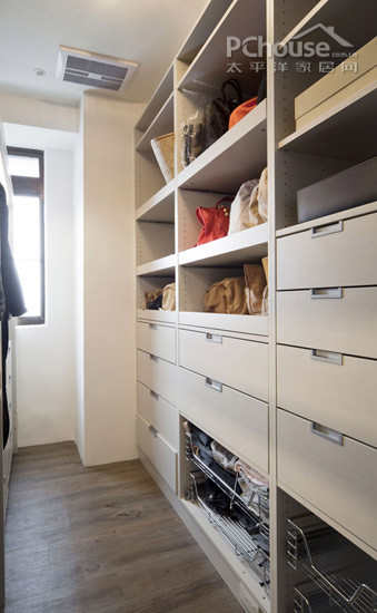 原本是2房2厅,次卧拥挤,设计师便做了一个大胆的改变,去掉次卧,用一个开放式的衣帽间代之,衣柜、五斗柜、梳妆台,有足够的位置收纳衣物杂物。