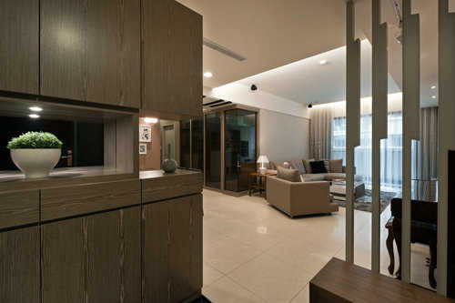 木皮铺陈出的玄关场域,以材质温润后方餐厅区黑白琴键的现代感。