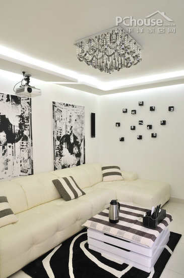 客厅的亮点在于电视背景墙,电视背景墙隔板与吊顶灯槽相互呼应,既起到装饰作用也具有实用性。电视背景墙灯槽延伸至吊顶,投影幕隐藏于吊顶,细节体现其中。