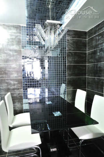 餐厅主题墙采用镜面马赛克饰面,与黑色钢化玻璃面餐桌相互呼应,也使整体空间对比鲜明、层次丰富。