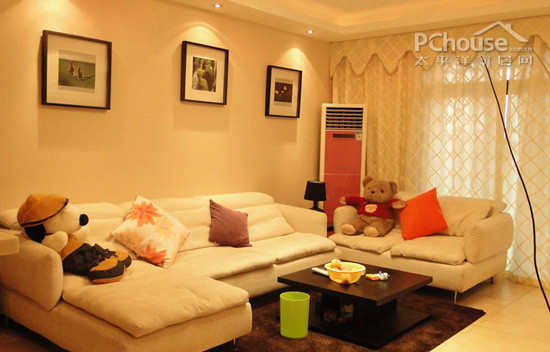 大白色的沙发和黑色的桌子,在色彩的搭配上也是一黑一白,简单自然。设计师善用网状窗帘,小小的点缀,却是给客厅蒙上了一层浪漫、少女般的纱。