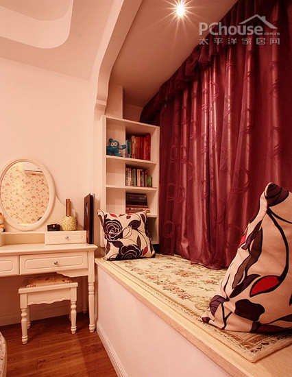 底部收纳:这个飘窗底部原本没有墙体,面积比较窄,保留原始形态的话有点浪费,所以就在底部设计收纳柜,再铺上粉红格子的小垫子,搭配小碎花的窗帘,就变成了一个充满浪漫氛围的小角落。