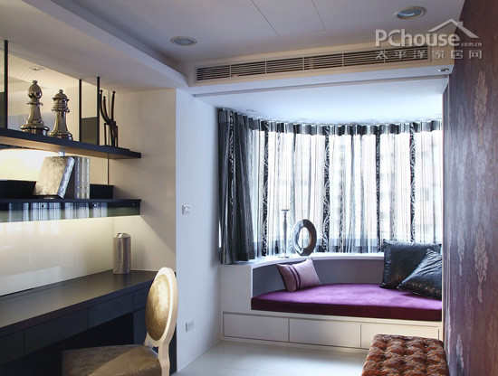 L型转角式飘窗:转角利用得非常好,一个延伸出来的弧度桌面,使得脚部得到很舒服的放置,利用书桌与飘窗的高度差,还形成了收纳的抽屉。