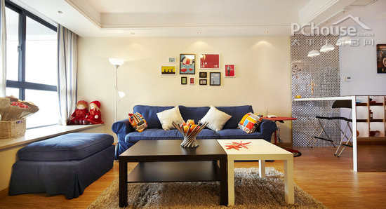 运用撞色的原理,设计师很巧妙地选择宝蓝色沙发,能与客厅的主色点形成鲜明的对比,使房间的色彩更加多样化。而且简单的天花板设置和大型飘窗使整个感觉更加明亮。