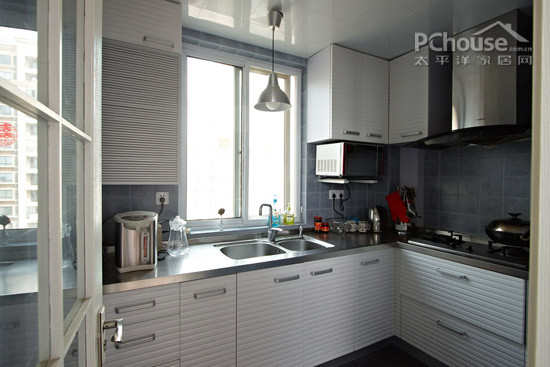 把厨房一边的墙体打掉,厨房的格局不变依旧为L字形,打掉的墙体换成抽拉的玻璃门,这样可以做大限度的保证客厅内的采光。
