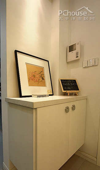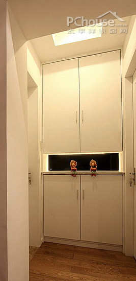 考虑到业主的职业和收纳需求,设计师在玄关处设计了2个收纳柜,一个是嵌入式的,一个是半高式,可以收纳零散的饰品,包包以及鞋子。