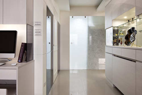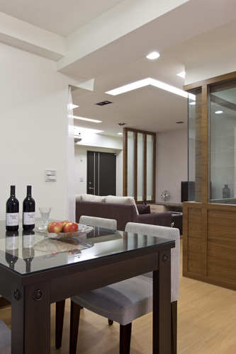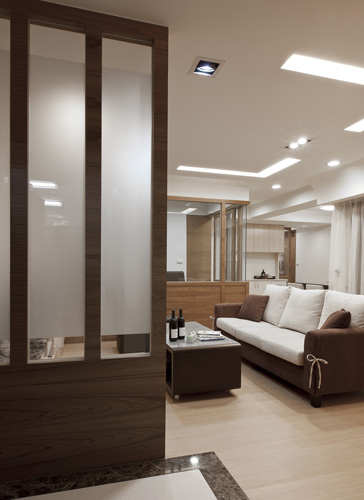 1.玄关-喷砂玻璃的屏风,适当地缓冲入口的视线;地坪转换也在无形中道出场域之分。