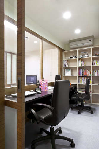 5.书房-除了有基本的收纳功能,书房必须能让夫妻同时使用,因此在玻璃隔间前方规划长桌,两人皆能拥有独立书桌。