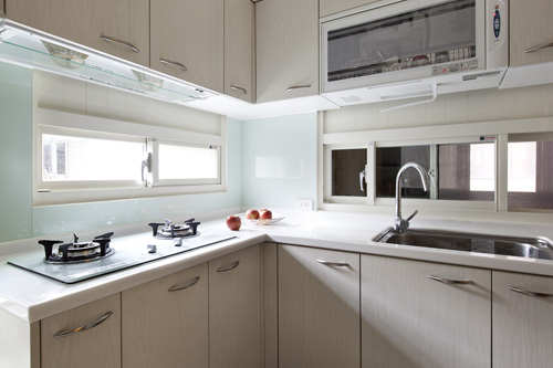 8.厨房-厨房一面有对外窗,另一面朝向阳台,因此设计师使用半腰式铝窗,保留明亮的采光来源。