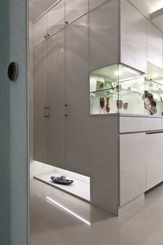 1.玄关-延伸到天花板的玄关柜,彻底利用空间以达最大收纳量,设计师细心地在底部留空打光,减少大型量体带来的压迫感。