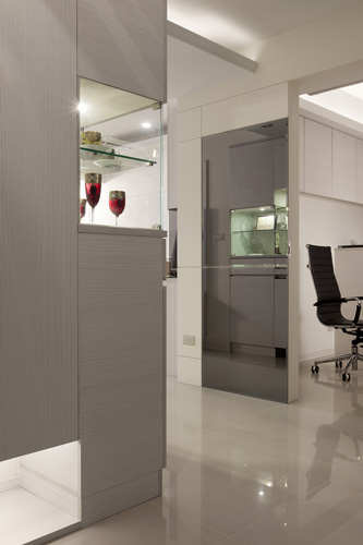 2.展示柜-转角柜以玻璃制造穿透感,通过玄关、走道均能欣赏到柜内摆饰品。