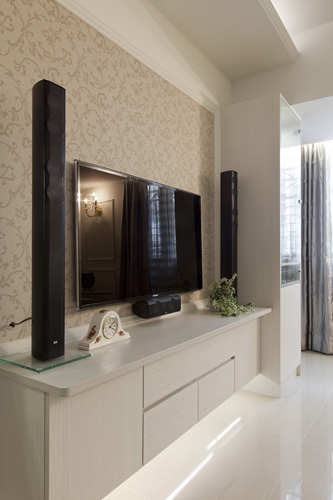 4.电视墙-白色线板框起花纹壁纸,平添典雅精致感;电视柜底部打光,更见轻巧和光影氛围。