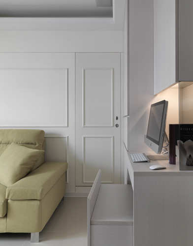 在玄关通往客厅的宽敞走道,隐藏一张轻巧简便的餐桌,就餐时间过后就能收到柜体内,不占用分毫空间。相同的手法再次延续到客厅,通往浴室的路线,若要加上桌椅势必得牺牲走道,设计师毫不妥协地灵活思考,在椅子上加入小巧思,不使用时也能收纳起来,净空走道还原最佳的舒适度。